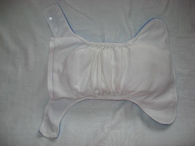Plenka má pěkný střih. Plenka těsní kolem stehýnek, ale zároveň neškrtí. Zmenšování se provádí pomocí patentek vpředu.Plenka velmi dobře sedí. Jedinou nevýhodou této plenky je zapínání- Plenku je nutné zapnout na 8 patentků. U menšího klidného dítěte to nevadí, ale u zdrhajícího prcka je to problém. |